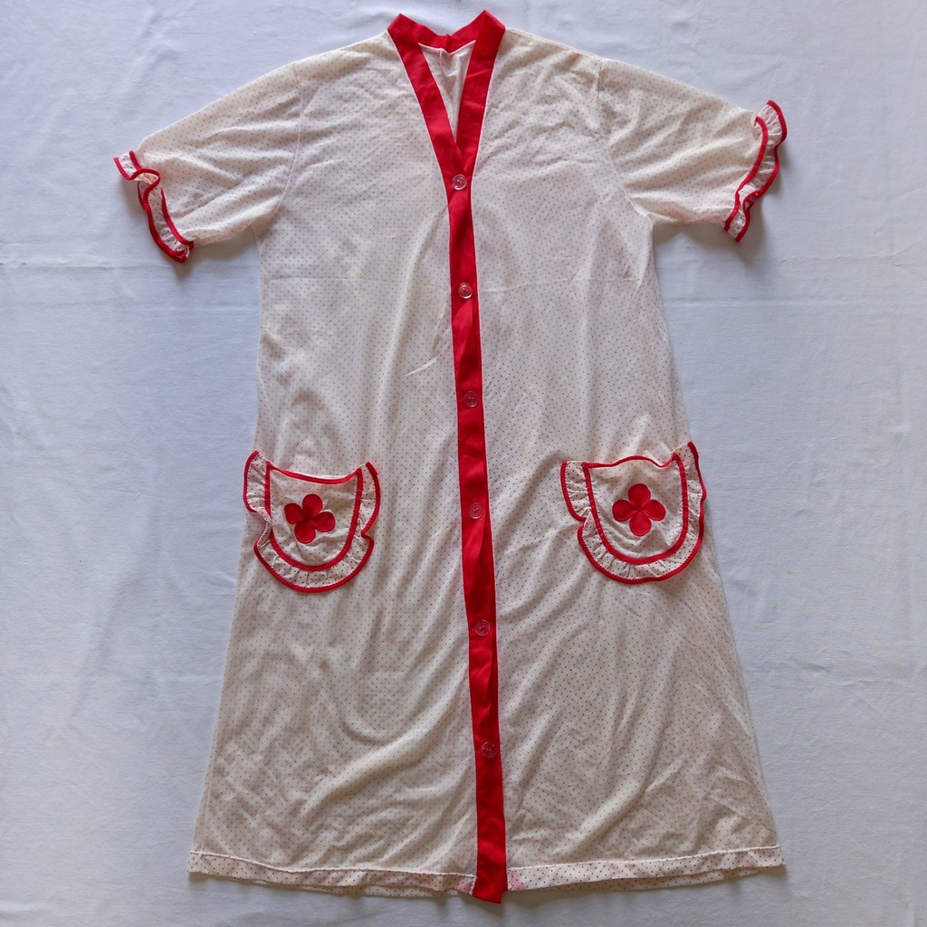 Camisola branca com bolinha vermelha contém conserto no bolso como mostra na foto porém em bom estado, em bom estado.