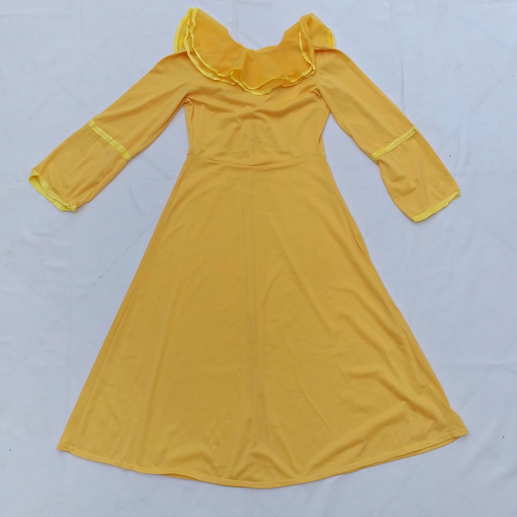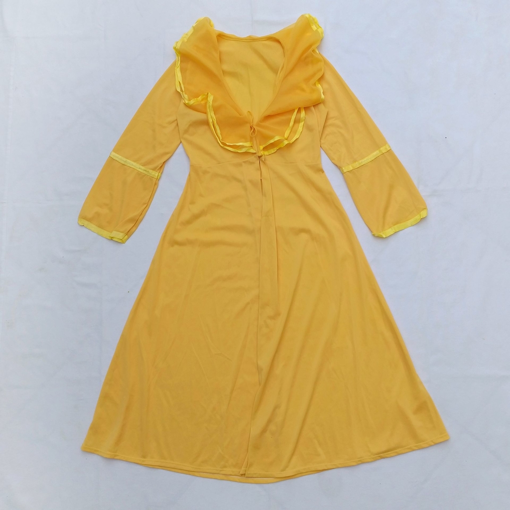 Penhoar amarelo com babado na gola contém fecho de fita e de botão, em bom estado.
