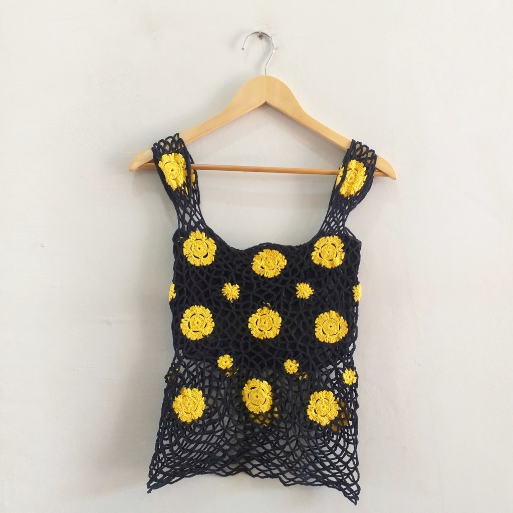 Regata de crochê amarela e preta com forro de meia apenas no busto, em bom estado.