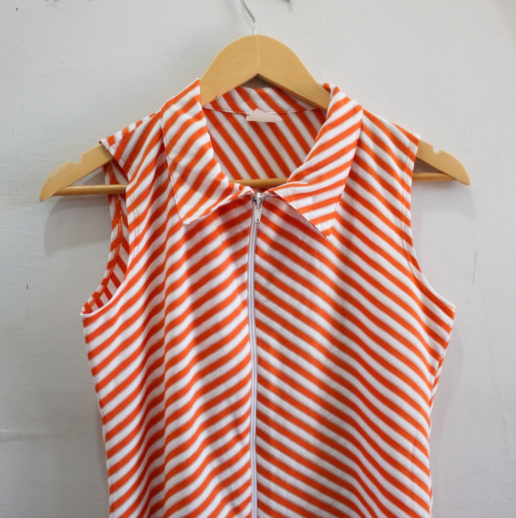 Regata listrada laranja cinza e branca com zíper na frente, em bom estado.